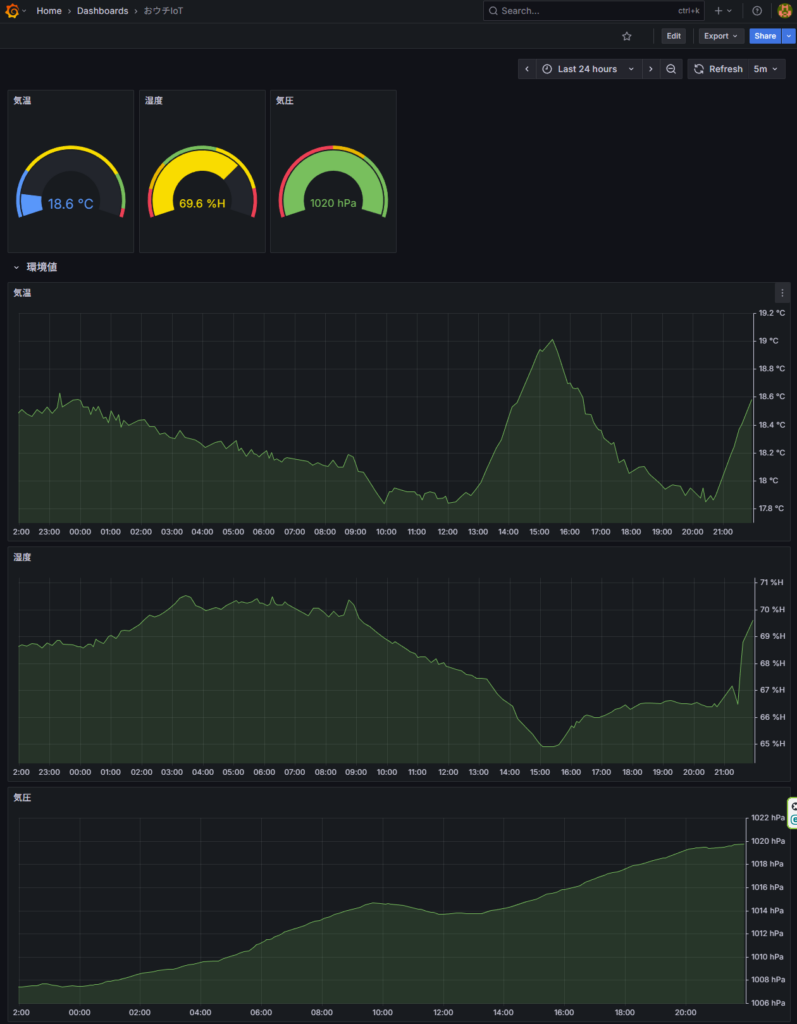 詳細な設定方法は割愛しますが、現在の(環境センサの)ダッシュボードは以下の様になっています。