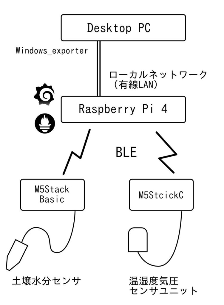 おウチIoTとは、「M5Stackシリーズでセンシング(環境値と土壌水分量)したデータをBLEで送信、Raspberry Pi 4で受信して保存、ダッシュボード(Grafana)にグラフ表示をする。」という至ってシンプル?なシステムです。図で表すと以下になります。(実際にはインターネットに出ていないので、IoTではないのですが。。。)